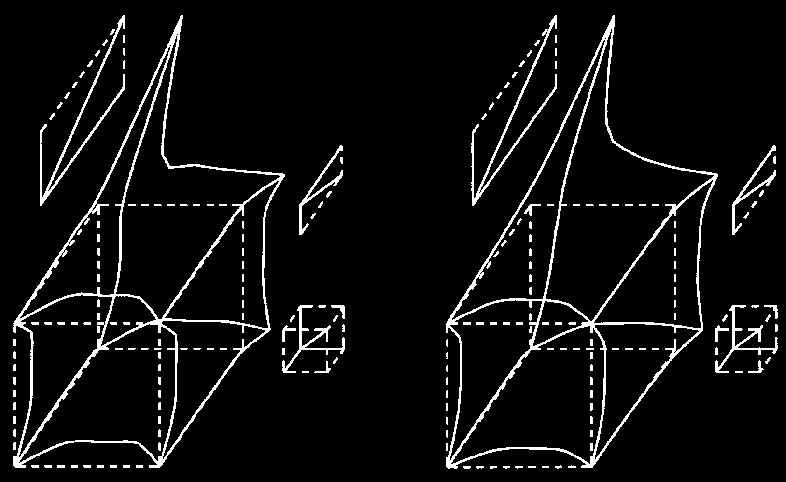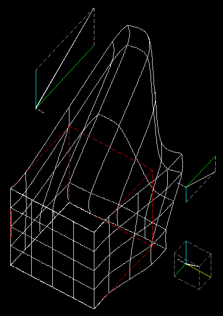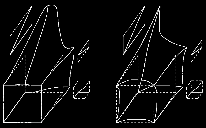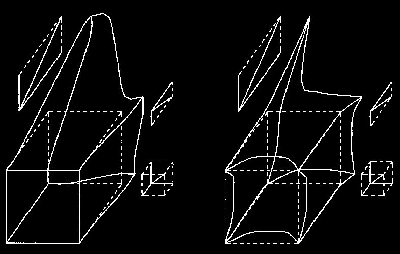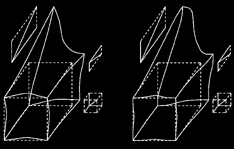 in funzione dell'esponenziale della distanza. Il cubo è stato suddiviso in parti per evidenziare gli andamenti di deformazione: risulta evidente che le parti più distanti dai "vettori forza" non vengono influenzate da questi ultimi. Ai lati del cubo sono evidenziati i tre "vettori forza" con le relative componenti: due vettori sono caratterizzati da due sole componenti, il terzo da tre distinte componenti in X, Y e Z. In colore rosso e in linea tratteggiata è mostrato invece il cubo di partenza. Come si può vedere più avanti, negli altri casi - usando altre "funzioni forza" - emergono alcune deformazioni "fantasma", applicate su punti non previsti della faccia anteriore del cubo. |